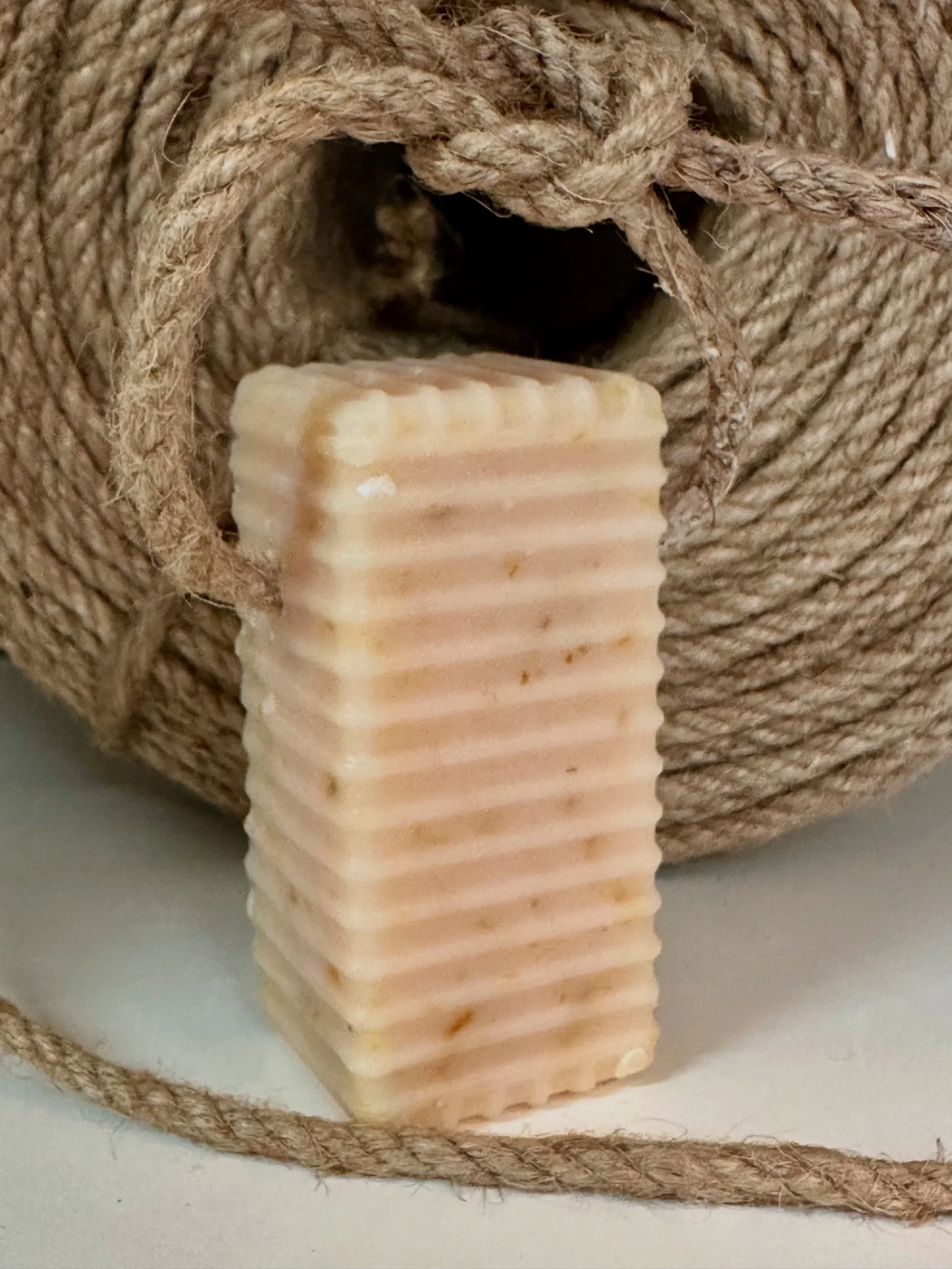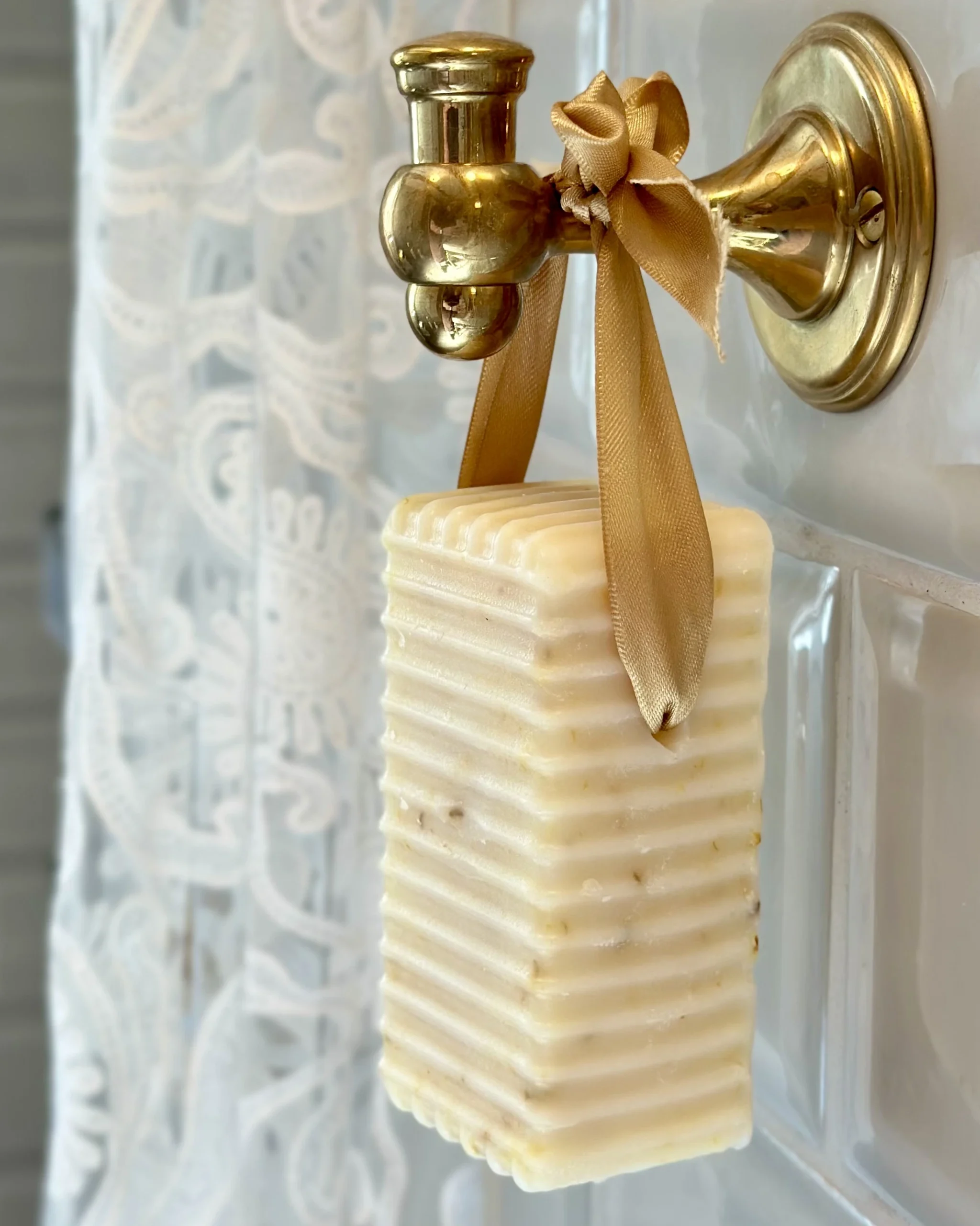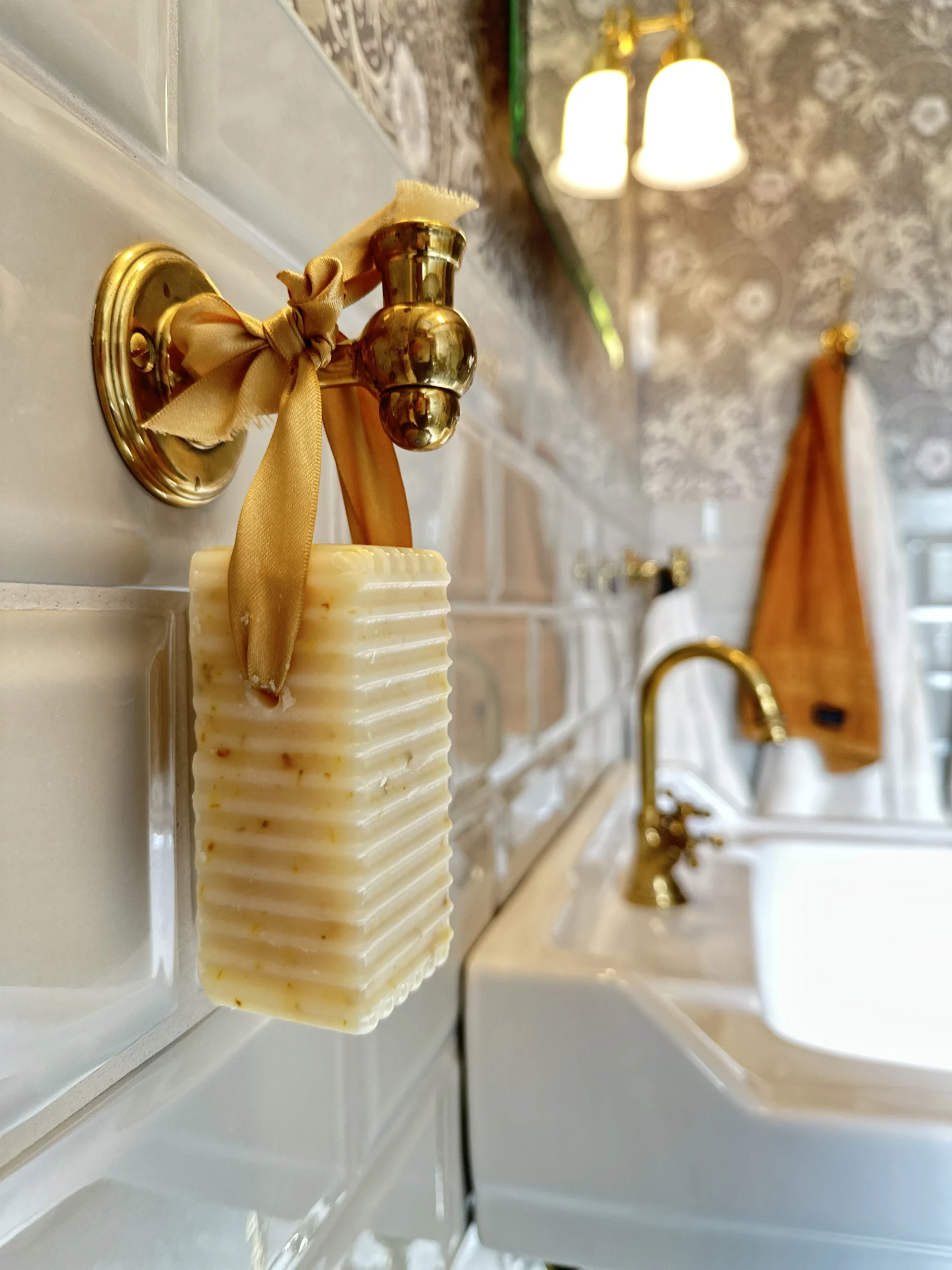 Nu till jul 2025 kommer tvålen med satin-band i rött eller guld. Har du särskilt önskan om färg så skriv ett meddelande vid check-out i webbshoppen. Tvålen kommer med juteband först i 2026.